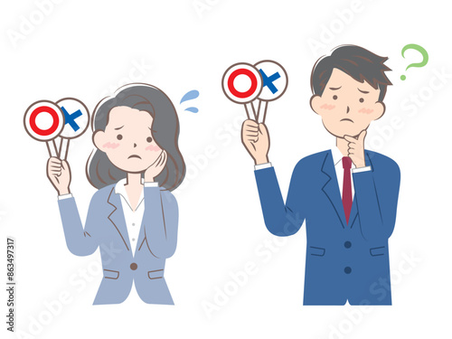 マルバツの札を持つスーツ姿の男女 正解 不正解 悩む