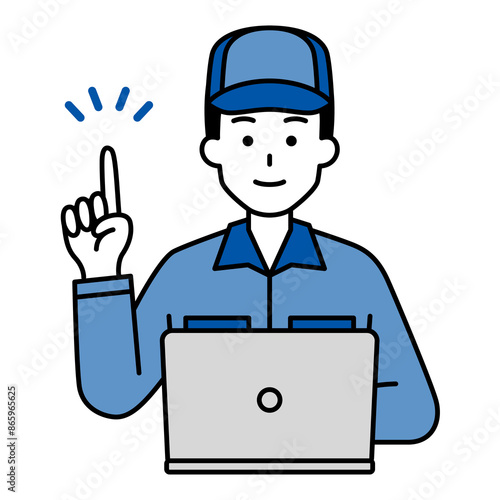 アイデアを提案するノートパソコンで仕事をしているつなぎ作業服の男性