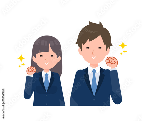 紺色のブレザーを着た学生男女。嬉しい、喜ぶ。