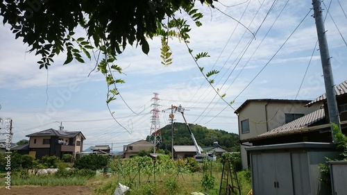 電柱工事と夏の空