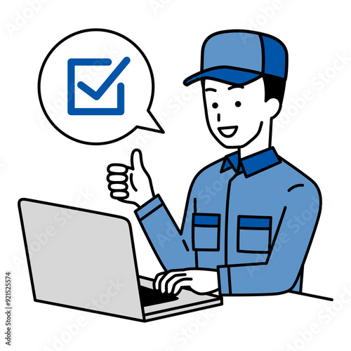 完了の合図をするノートパソコンで仕事をしているつなぎ作業服の男性