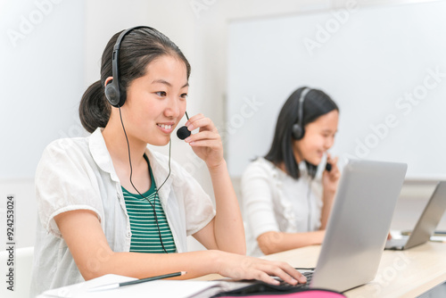 ヘッドセット・インカムをつけて英会話・オンライン塾・家庭教師で勉強する小学生・中学生の女の子