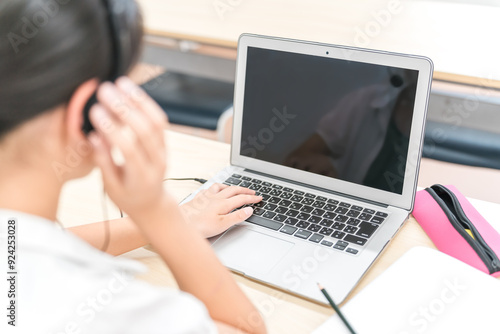 学校でパソコンを使って英会話・英語のリスニングをする子供の後ろ姿(小学生・中学生・高校生)