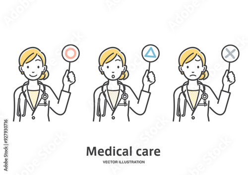 まる、三角、バツの看板で回答する女性医師