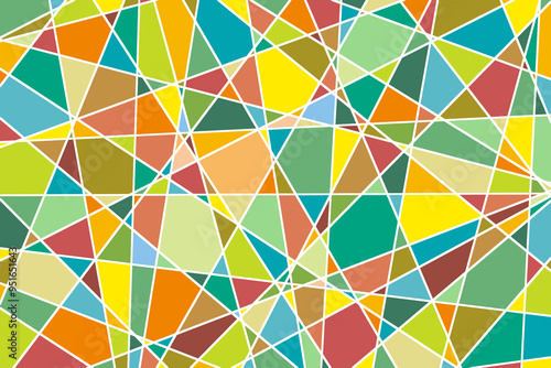 たくさんの直線で区切られたランダムな色面構成、ややくすんだ緑や黄色や赤
