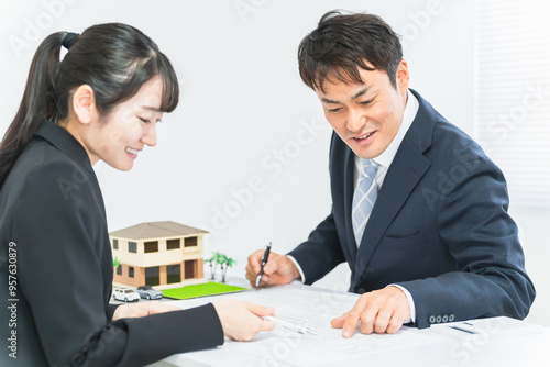 設計事務所でミーティング・会議をする笑顔のビジネスマン男女