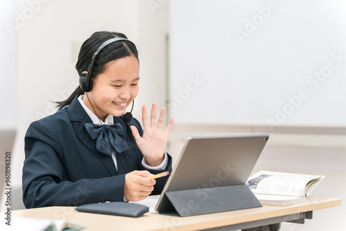 パソコンを使って勉強する制服姿の小学生・中学生・高校生の子供(オンライン英会話)