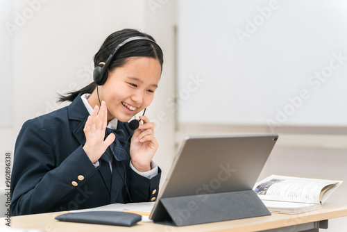 パソコンを使って勉強する制服姿の小学生・中学生・高校生の子供(オンライン英会話)