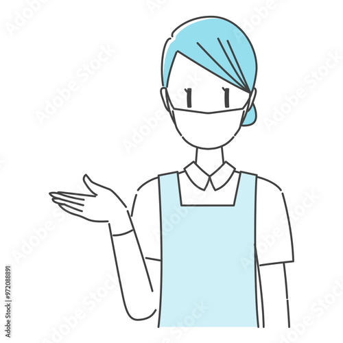 モノカラー・青、寒色系、エプロン姿、マスクとグローブ着用、制服・笑顔で案内する歯科衛生士・歯科受付の女性スタッフ