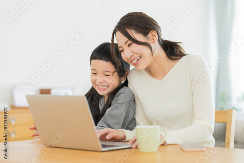 ノートパソコンを見る母親と女の子