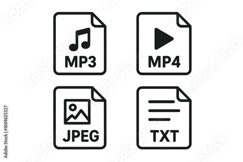 File format icons set. MP3, MP4, JPEG, TXT document types. Audio, video, image, text file symbols. Vector multimedia graphic for web, ui, ux, app design.