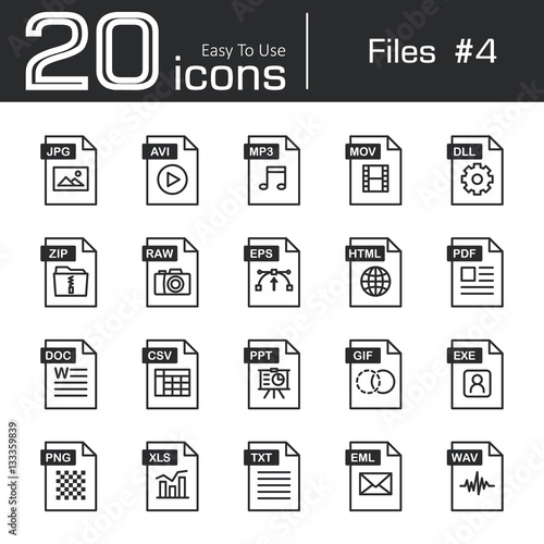 Files icon set 4 ( jpg , avi , mp3 , mov , dll , zip , raw , eps , html , pdf , doc , csv , ppt , gif , exe , png , xls , txt , eml , wav )