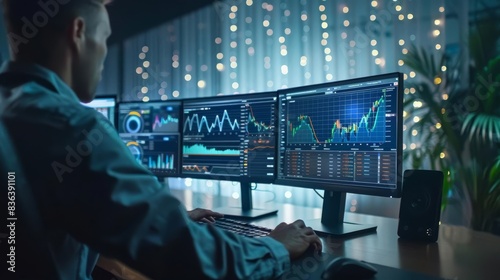 Finance Professional Reviewing Market Trends on Multi-Screen Setup in Modern Office
