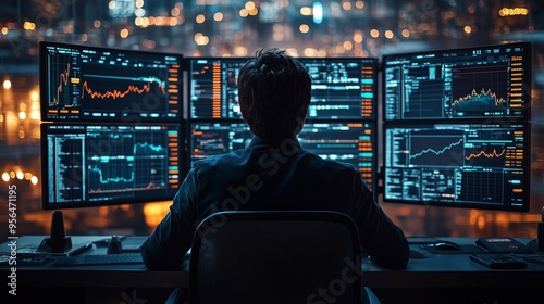 Financial analyst is working late, using multiple monitors displaying analytics data