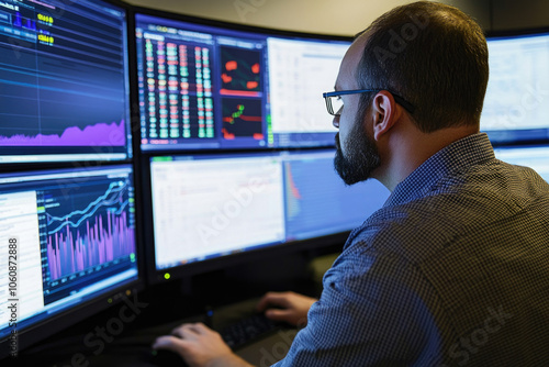 Financial analyst monitoring cryptocurrency trends and global stock markets in a modern trading room