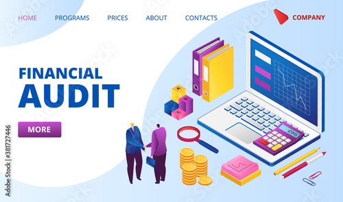 Financial audit landing web page vector illustration. Magnifying glass, analysis of financial report. Finances and auditors concept. Auditing tax process. Management in business.
