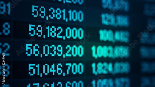 Financial data in term of a digital prices on LED display. A number of daily market price and quotation of prices chart to represent candle stick tracking in Forex trading.