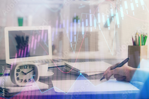 Financial graph displayed on woman's hand taking notes background. Concept of research. Multi exposure