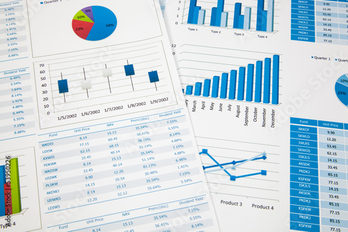 Financial paper charts and graphs