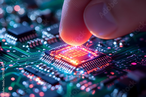 Finger presses lit chip on circuit board; close-up view for electronics industry