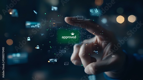 Finger touching virtual approved button with futuristic interface elements, digital locks and network connections on dark background with bokeh effect.