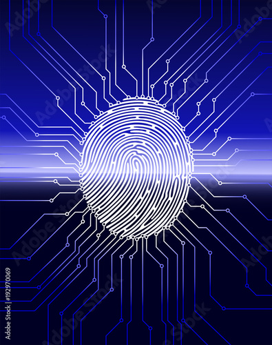 Fingerprint scanning, digital biometric security system, data protection, dark blue background, vector illustration