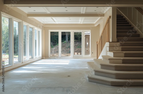 Finish basement with large windows and white textured ceiling, no furniture in the room, wall texture showing that has not yet been painted