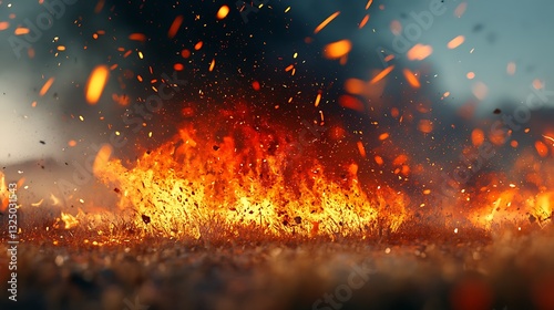 Fire explosion on field, outdoor, dramatic, disaster