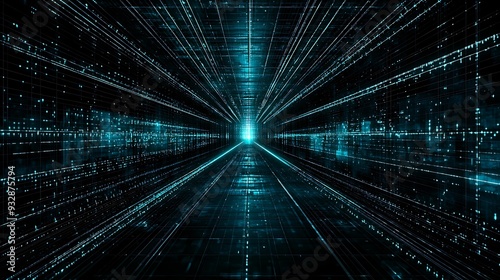 First person view of a complex algorithmic space with topology and multidimensional mapping elements, copy space for text,