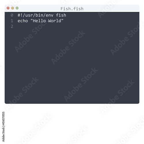 Fish language Hello World program sample in editor window
