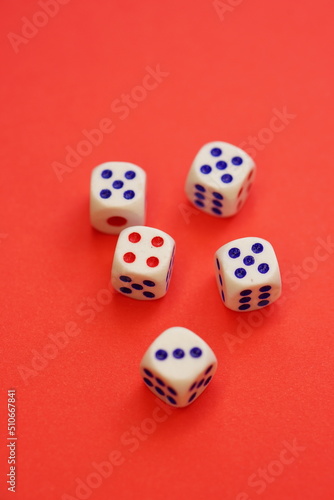 Five dice with different numbers on a red table
