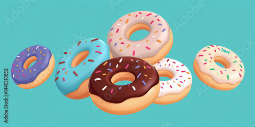 five donuts arranged in a dynamic, floating layout against a light blue background
