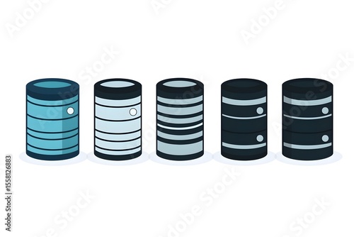 Five stylized database server icons with varying designs arranged horizontally showing data concepts or storage