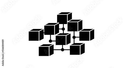 Flat black icon of multiple boxes connected by nodes, distributed supply system, isolated on white