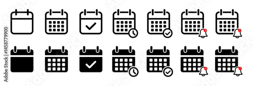 Flat calendar icon set with check marks, clocks, and reminder bells. Minimal vector style for apps, scheduling, planning, events, and notifications. Ideal for UI, UX and digital interfaces. Icons.