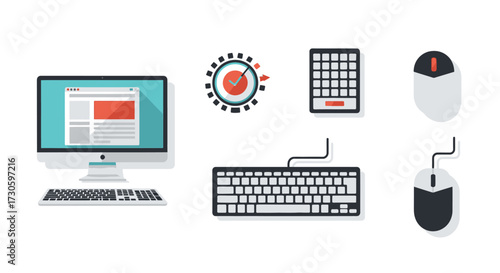 Flat Design Computer Set - Monitor, Keyboard, Mouse, and Other Icons.