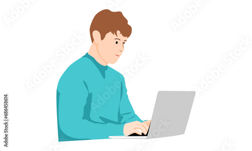 flat illustration of man at his desk is working on the laptop computer