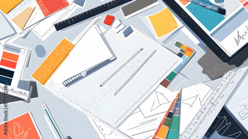 Flat lay of a messy workspace with design tools, papers, and a notebook.