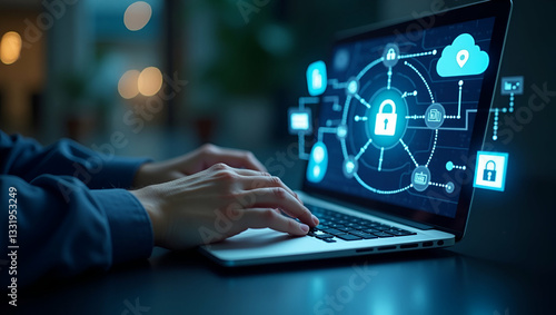 Flat Programmer Engaging with Laptop: Exploring API Development, Security, and Cloud Computing Icons
