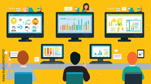 Flat style web meeting illustration, showing participants on separate screens, bright and clear layout