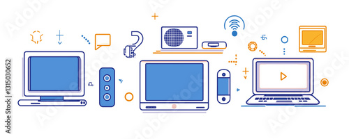 Flat technology devices icons set - electronics, gadgets, and multimedia in linear style.