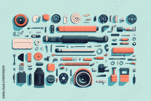 Flat-lay mechanical parts spread out on light blue background