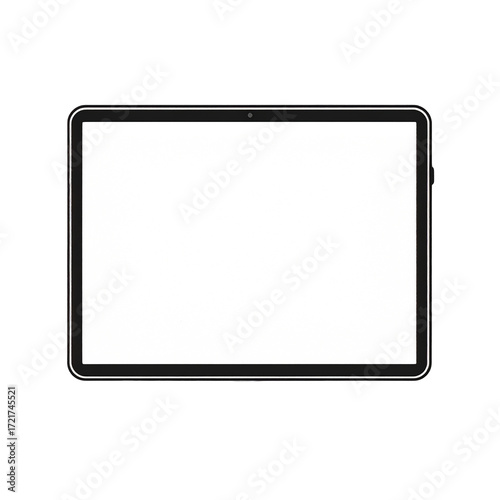 Flat-screen tablet, blank display. A modern tablet computer, rectangular, with a large, empty, white screen. Dark frame surrounds the screen