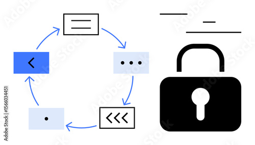 Flow diagram with arrows, various blocks for data flow, and large lock icon. Ideal for data security, privacy, encryption, information management, workflow design, system security simple landing