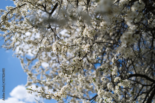 Flowering apple tree with white flowers on a spring sunny day with blue sky