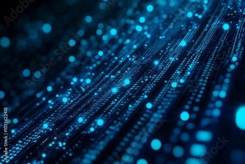 Flowing blue digital particles and light trails form an abstract futuristic pattern, digital technology background.