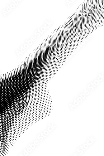 Flowing dots particles wave pattern 3D curve halftone black gradient curve shape isolated on white background.