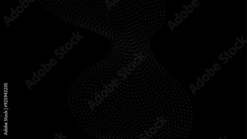 Flowing dots particles wave pattern 3D curve halftone gradient curve shape isolated on black background. Vector in the concept of technology, science, music, modern, cover, poster, flyer, card, web.