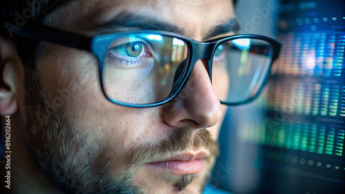 focus on eye close-up view. Focused developer coder wears glasses working on computer looking at programming code data cyber security digital tech reflecting in spectacles developing software program.