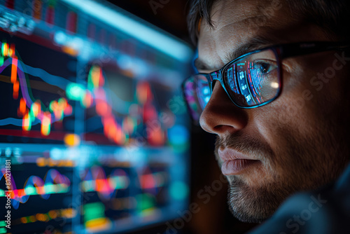 Focused analyst examining colorful data on multiple screens
